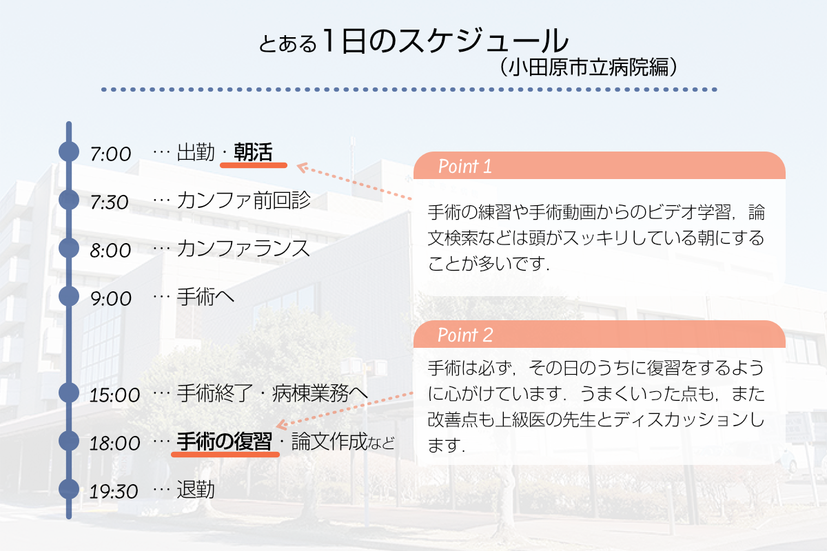 朝の勉強から夕方の振り返りまで,濃密な1日のスケジュールですね.小田原市立病院は西湘地区を代表する基幹病院のひとつで,その充実ぶりが伝わってきます.